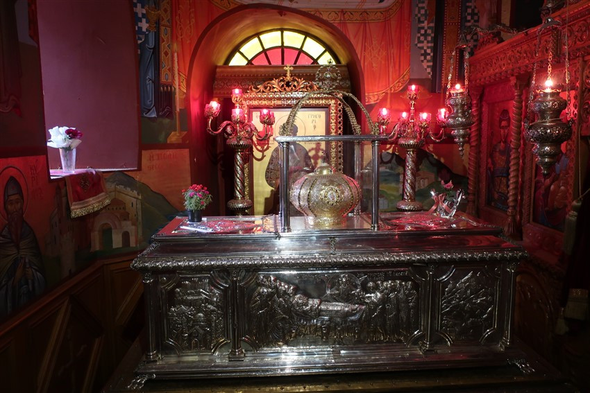 Мощи святителя Григория Паламы покоятся в красивой серебряной раке слева от входа в храм.