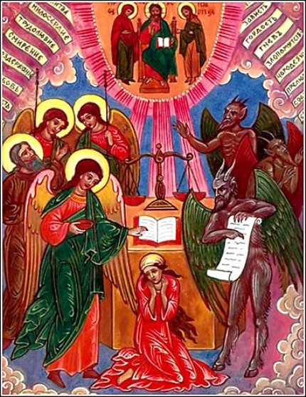 Когда приближаются владычные силы, когда приходят страшные воинства, когда божественные изъятели повелевают душе переселиться из тела, когда, увлекая нас силою, отводят в неминуемое судилище, тогда, увидев их, бедный человек... весь приходит в колебание, как от землетрясения, весь трепещет... Божественные изъятели, взяв душу, восходят по воздуху, где стоят начальства, власти и миродержатели противных сил. Это — злые наши обвинители, страшные мытники, описчики, данщики; они встречают на пути, описывают, осматривают и вычисляют грехи и рукописания этого человека, грехи юности и старости, вольные и невольные, совершенные делом, словом, помышлением. Великий там страх, великий трепет бедной душе, неописуема нужда, какую потерпит тогда от неисчетного множества тьмами окружающих ее врагов, клевещущих на нее, чтобы не дать ей взойти на небо, поселиться в свете живых, вступить в страну жизни. Но святые ангелы, взяв душу, отводят ее".