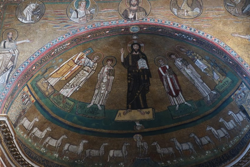Апсида церкви украшена мозаикой IX века, изображающей Христа в окружении апостолов и святых, а также папы Григория IV с квадратным нимбом.