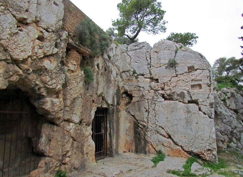 Пещера-темница находится на живописном холме, сквозь стены пробивается зеленая трава, на крыше растут деревья. О предназначении этого места напоминает разве что табличка-указатель.